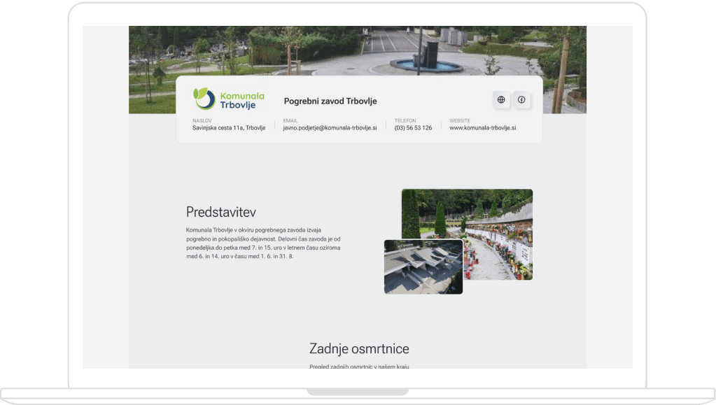Ne, kasneje vam ne bo treba skrbeti za vašo spletno stran! Potrebnih je zgolj teh 20 minut, da vstavite potrebne podatke in slike in to je vse. Seveda, v kolikor boste želeli, lahko stran kadarkoli dopolnite in dodajate nove informacije, ne bo pa to potrebno. Za osveževanje vaše strani z najbolj relevantnimi podatki za uporabnike, je dovolj zgolj ažurno dodajanje osmrtnic in časa pogrebov, kar pa je v vašem interesu, ker vam prihrani čas.